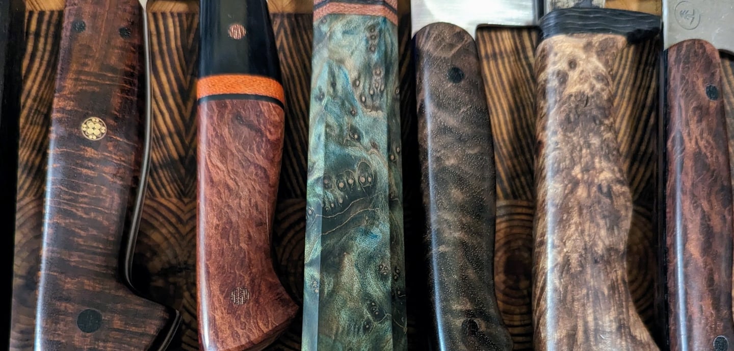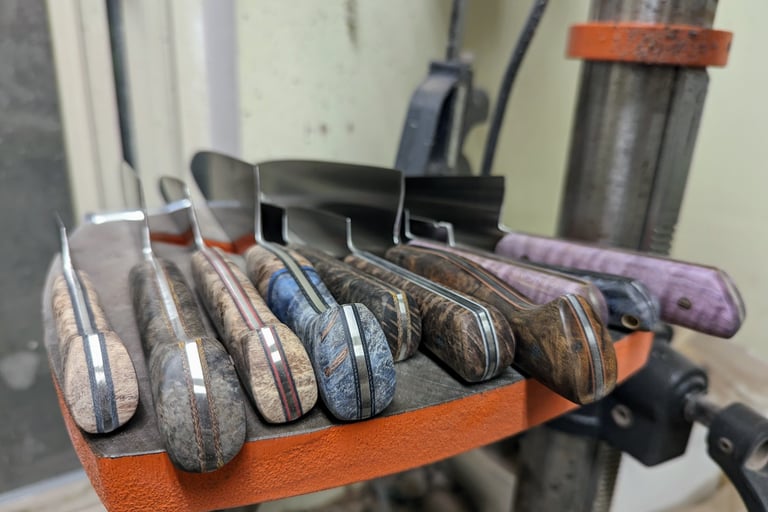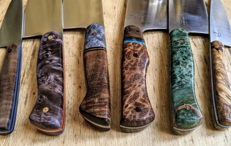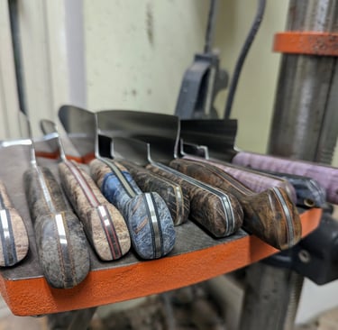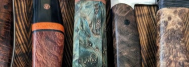 Almost all the wooden handles I use have been stabilized by K&G (the gold standard in resin impregnation) to make them dimensionally stable, hard, and take a beautiful polish. The only exceptions are woods that are already incredibly dense and oily and won't take the stabilizant (cocobolo, African blackwood, verawood, etc.). Some blocks of wood are dyed prior to stabilization to add an element of color while still maintaining the beautiful wood grain.