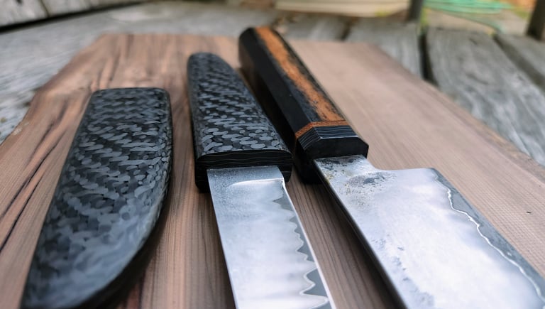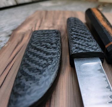 I occasionally use synthetic materials in my handles as well. Largely this is either Micarta (canvas, linen, or paper bound in a phenolic resin), G10 (fiberglass sheet layered in resin), or carbon fiber. While I use them mostly for colorful accents to wood handles or bolster materials, they make excellent and durable handles on their own.